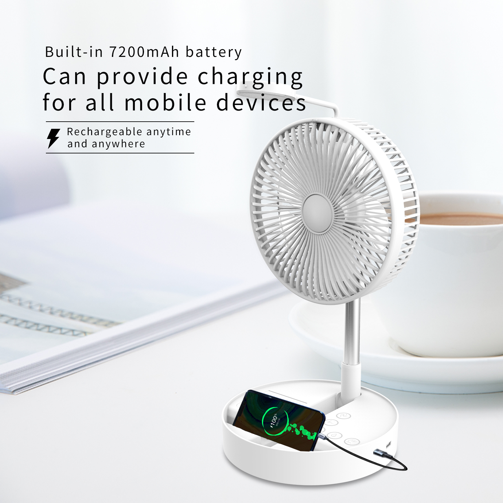 2, [Wireless Working & Built-in 7200mAh Battery]:The standing / desk fan runs on 7200mAh large rechargeable battery, Morn than 4 hours full-charged, ensure wireless working 6 ~ 24 hours, 4-speed, working time depends on different speed. When the fan is powered, it can be used as an emergency mobile power source to charge mobile phones, tablets or other devices.