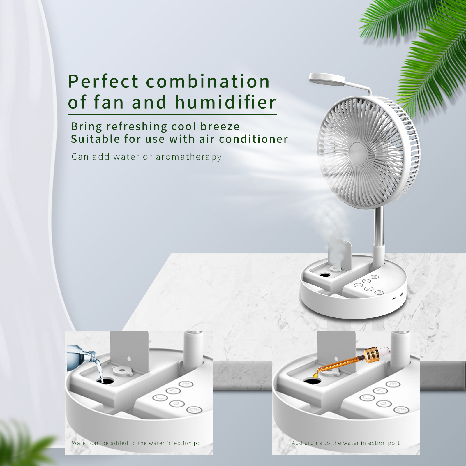 3, [Table light & Night light & Humidify function]:On the top of the fan, a folding light is installed, pull it up, which can be used as a table lamp, and the lamp is adjustable. Meanwhile, you can drop some water on the top hole, it become a humidifier. and on the bottom, have a night light, it is also adjustable. It is very suit for children room or bedroom.